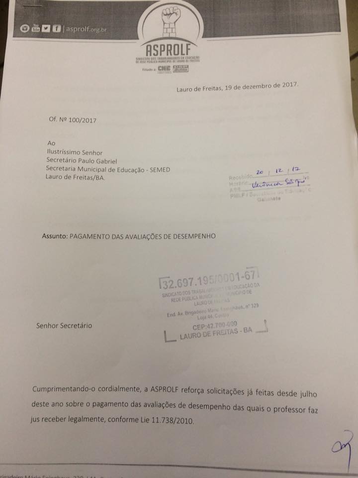 20/12/2017 0 1176 A ASPROLF protocolou hoje (20), à tarde na SEMED documento ofício cobrando do Executivo o pagamento das avaliações de desempenho dos professores. Confira o documento.