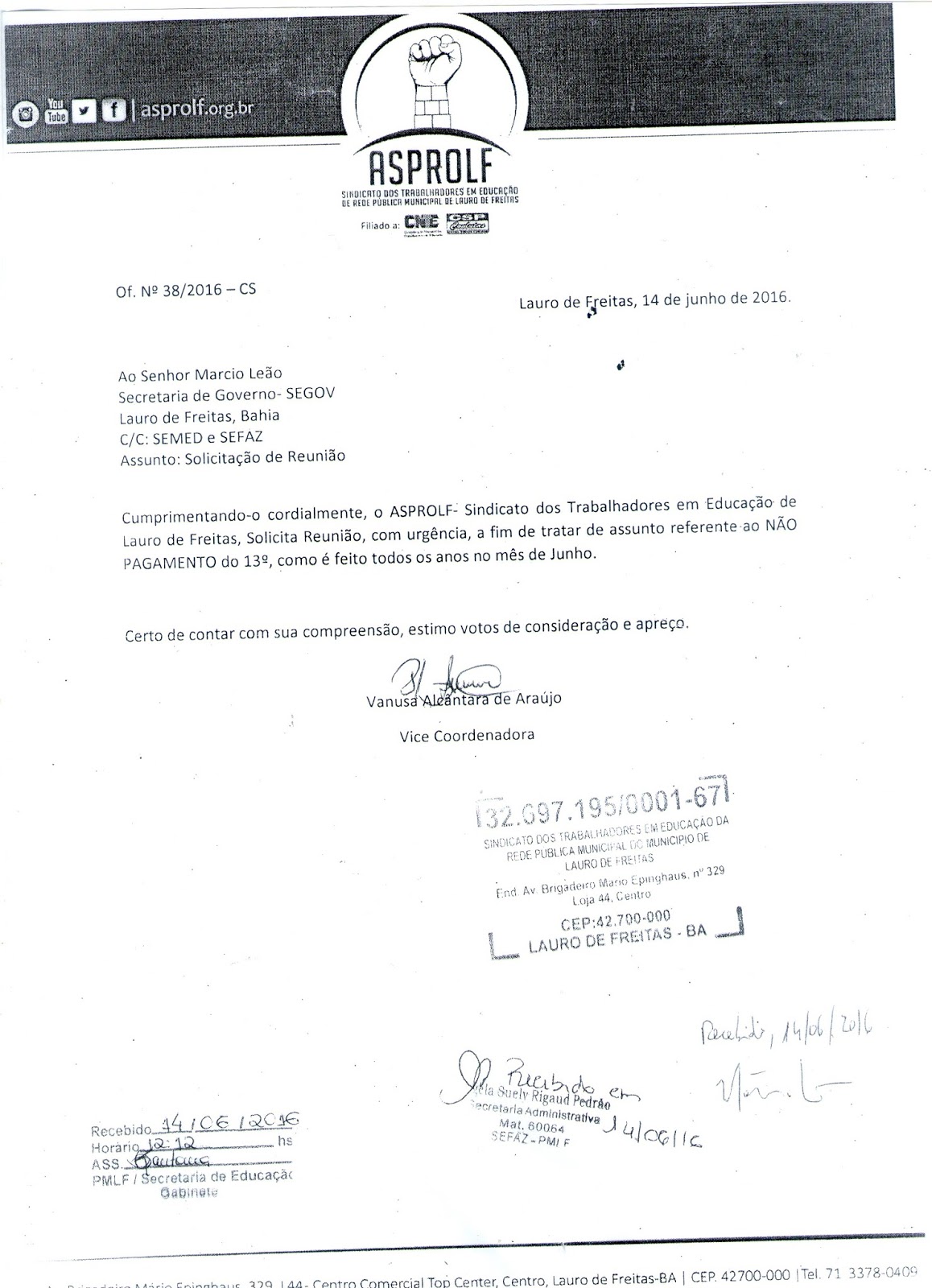 O ASPROLF, atento ao que vem ocorrendo no município e que atinge diretamente a nossa categoria, mesmo tendo o conhecimento sobre a legalidade da medida que define o não pagamento dos 50% do 13º Nosso entendimento é que toda questão política deve ser discutida politicamente, motivo pelo qual estamos tentando agendar uma reunião com o Executivo Municipal, como pode ser visto no documento abaixo.