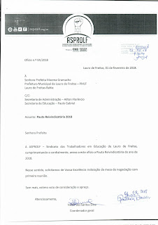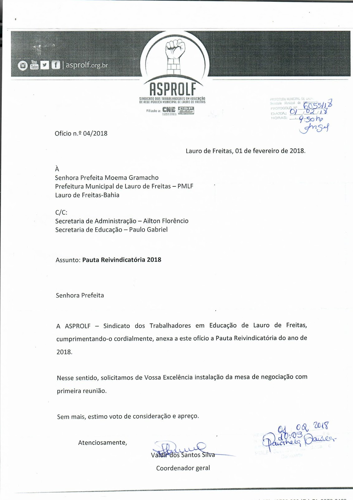 O Coordenador Geral do ASPROLF, Valdir Silva, protocolou na manhã de hoje (01/02), um documento ofício com a Pauta Reivindicatória 2018 dos Trabalhadores. O documento foi entregue ao Executivo com a solicitação de instalação de mesa de negociação para primeira reunião.