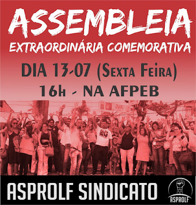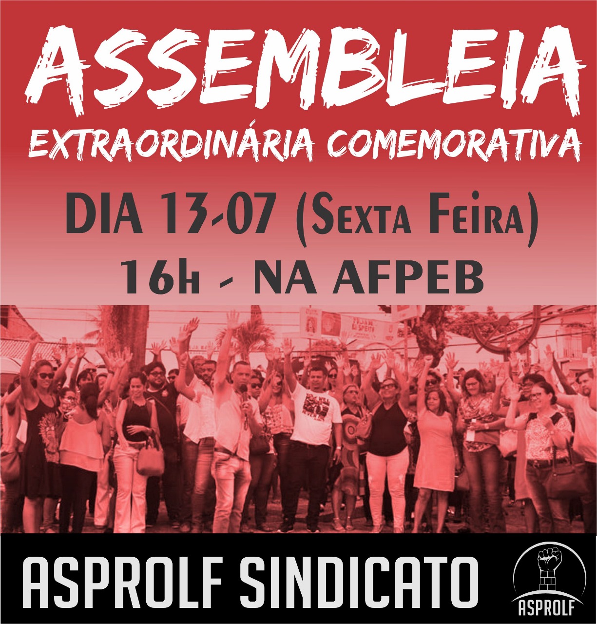 Companheiros/as, finalizamos o primeiro semestre e já iniciamos o segundo. Como atividade da ASPROLF, resolvemos, este ano, aproveitar a vitória da categoria no destravamento da carreira através dos quase 400 processos publicados (ainda teremos mais esta semana, e este mês), para fazer um balanço da nossa luta e das nossas conquistas. Por isso, convocamos essa Assembleia Extraordinária Comemorativa. Temos muito que agradecer a Deus.
